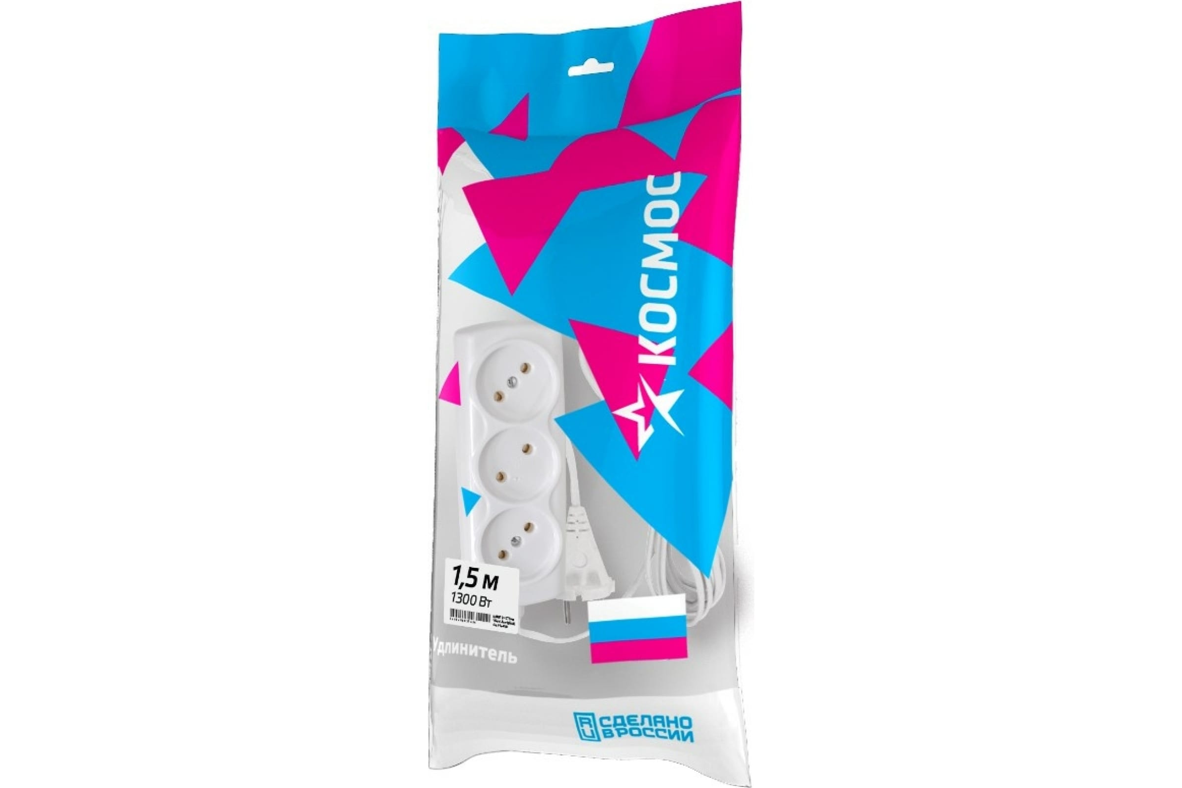 Сетевой удлинитель КОСМОС 3 розетки, 6А, 1300Вт, 1.5м, ШВВП 2х0.75, Р16-010, белый